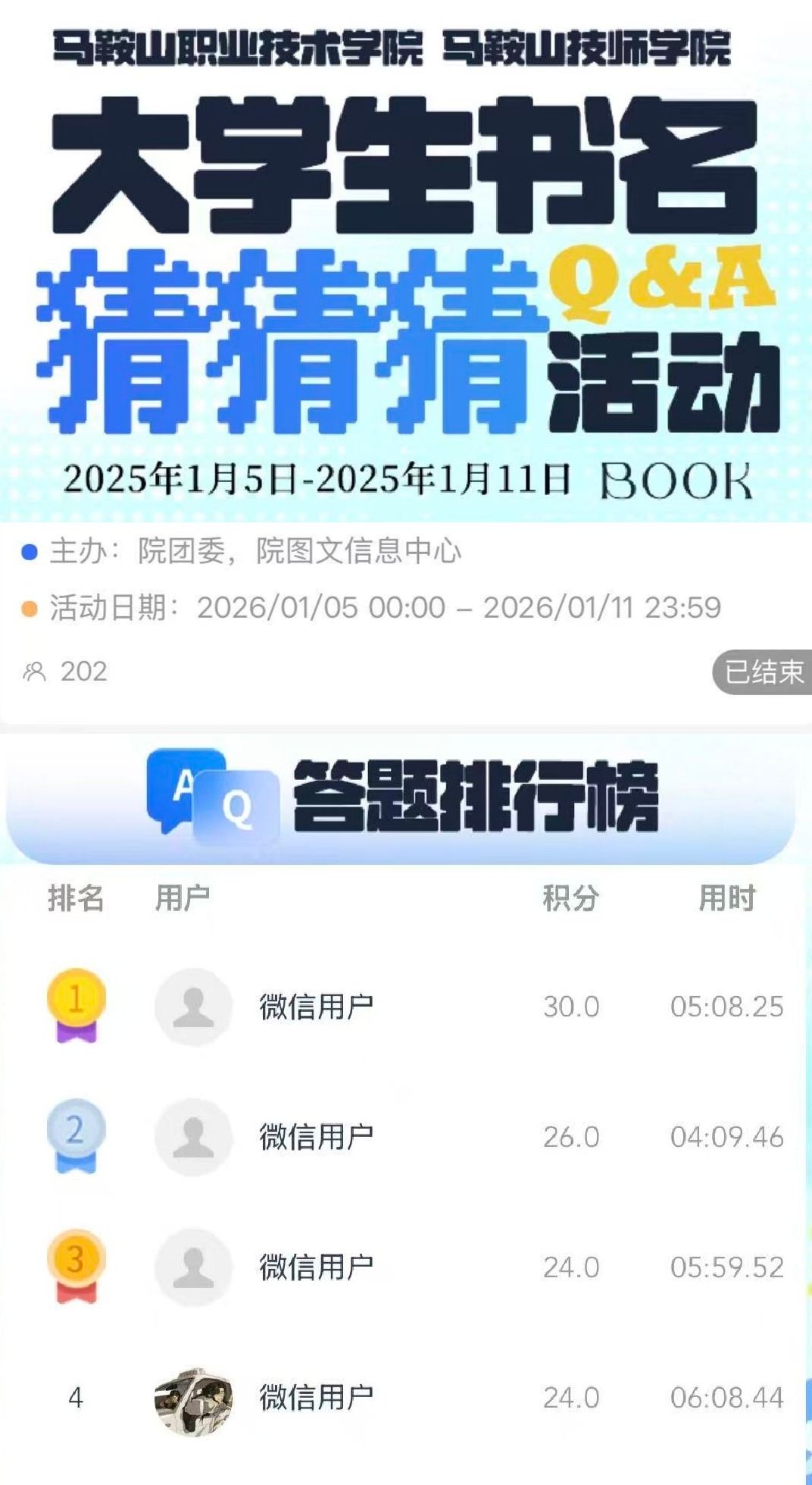 本次活动由学院图文信息中心与团委联合主办、读书爱好者社团承办,依托“语林鸟”小程序开展。竞赛采用“关键词猜书名”形式,通过一系列生动且富有提示性的描述,引导学生竞猜涵盖经典名著、流行小说、科幻奇幻等多个领域的经典作品。活动以趣味互动引导学生重温经典、拓展视野,有效提升了阅读的吸引力和参与感。