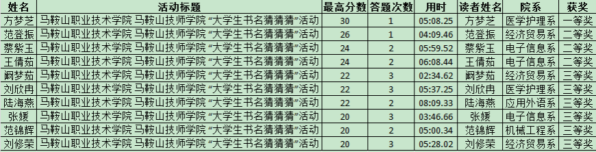 1月5日至11日,学院图书馆“大学生书名猜猜猜”线上知识竞赛在语林鸟平台成功举办,活动吸引了全院两百余名学生积极参与。经过云端竞答,医学护理系方梦芝等十名同学凭借丰富的阅读积累分获一、二、三等奖。