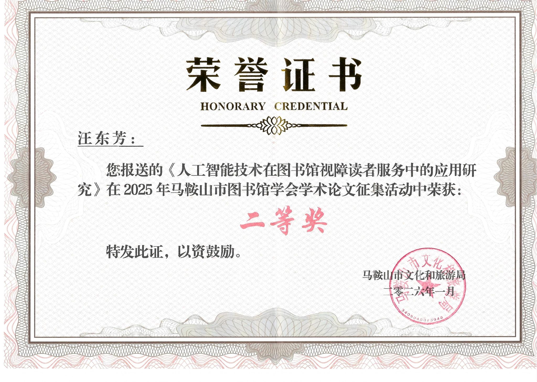 近日,马鞍山市图书馆学会公布2025年学术论文和业务案例征集活动获奖结果。我校图文信息中心汪东芳老师撰写的《人工智能技术在图书馆视障读者服务中的应用研究》荣获学术论文类二等奖。