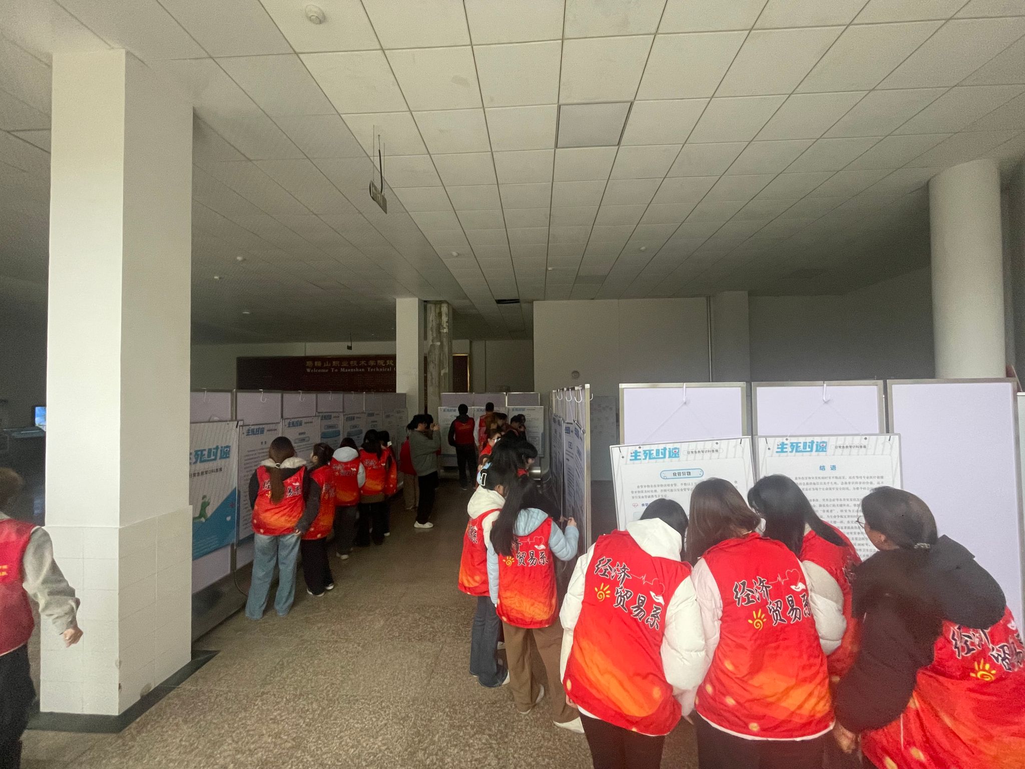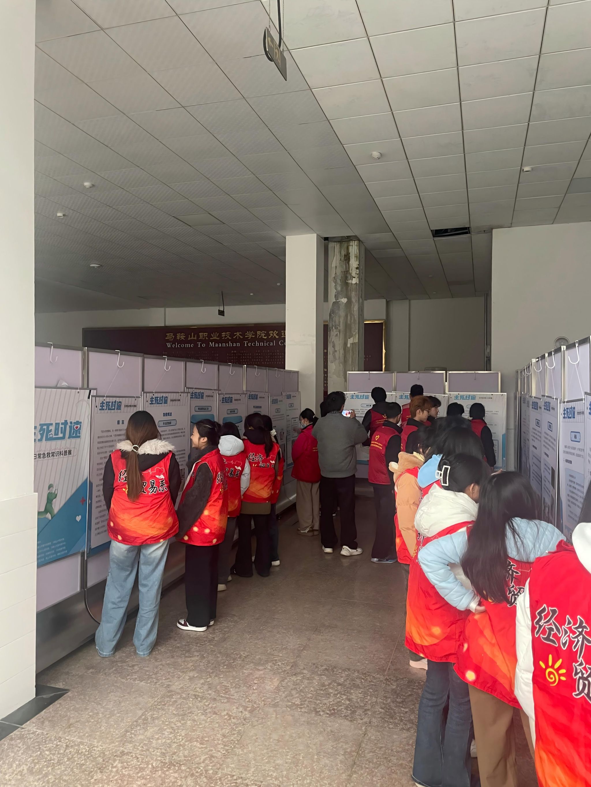 近日,由学院图文信息中心联合马鞍山市图书馆共同举办的“生死时速——日常急救常识科普展”在图书馆大厅开展。展览通过图文展板,向师生系统普及急救理念、常见急症处理及家庭药箱配置等知识,旨在提升师生应急救护能力,助力平安校园建设。